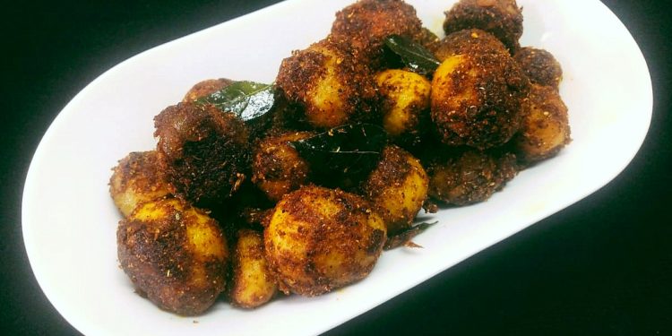 Heat 2 tbsp of Oil in the same pan. Add Aniseed and stir cook for few seconds. Add Curry Leaves, Onion, Ginger Garlic Paste and sauté them till the Onion turns translucent. Add the boiled Baby Potatoes, Salt and Turmeric Powder. Cook for a couple of minutes. Add 3 to 4 tbsp of water. Mix well. Simmer for some minutes in medium flame so that the Potatoes absorb the flavor of the Garlic. Add the prepared Chettinad Masala powder. Roast for few minutes. Add 2 to 3 tbsp of water. Mix and simmer for 3 to 4 minutes in low medium flame. Roast till the moisture evaporates completely. Transfer to a serving bowl.