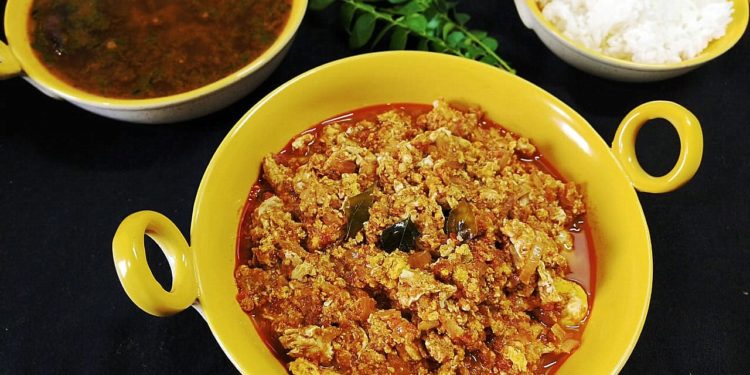 Heat the Oil in a pan. Add Curry Leaves. And within a few seconds, add the Red Chilli Powder. Stir them together. Add Coriander Powder and Saunf Powder. Mix again. Add the crushed Tomatoes and Salt. Cook in medium flame till the gravy turns thick. Add required water. And simmer to boil. Check the seasoning and adjust. Break each Egg into the boiling gravy. Add the finely chopped Onion. Cover the pan and simmer for 2 to 3 minutes. Stir gently without breaking the eggs. Cover with a lid and continue to simmer for another one or two minutes. The simple Egg curry is ready.