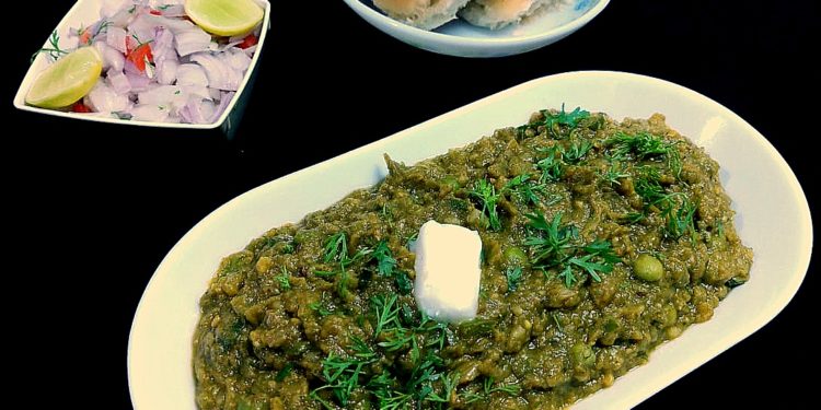 Add Spring Onion Greens. Simmer for 2 more minutes. The Green Pav Bhaji is ready. Transfer to a serving bowl and place a blob of Butter on the top.
