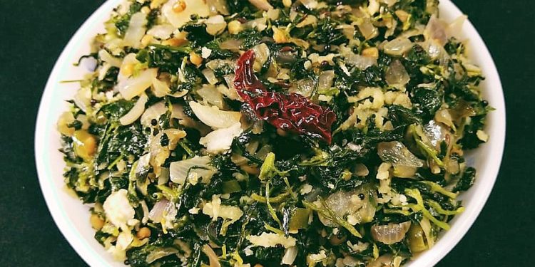 Add the chopped Fenugreek Leaves. Add Salt (add very little Salt since the Fenugreek Leaves have salt in itself.) Cook till the leaves are well cooked and no moisture is left out. Add the Grated Coconut and give a good stir.