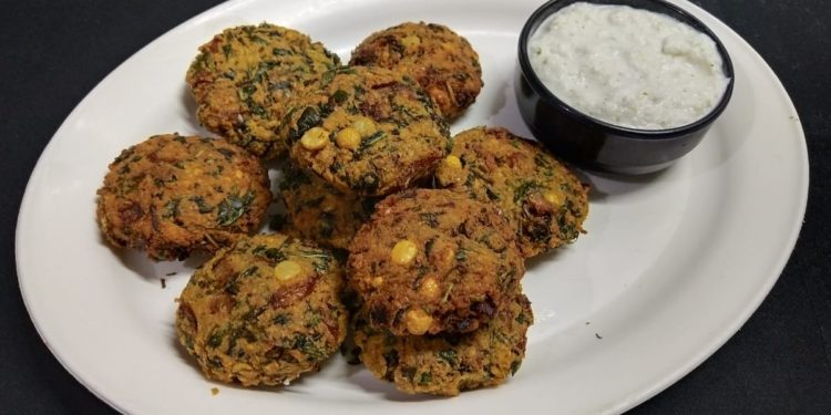 Keerai Vadai is a crispy and healthy snack prepared with a mixture of lentils and leafy greens. It is a very popular South Indian snack and available in all the tea shops. I rememeber as a kid going to the small shops in my hometown of Tirunelveli looking forward to buying this vadai. The shopkeeper always used to wrap in a newspaper that is a day old. The smell of the hot vadai would almost make it impossible to wait till I got home to eat it. I recreate this memory whenever I can and especially on a rainy day when a hot crispy vadai tastes even better! You can serve this as an evening snack with a cup of coffee/tea or as an appetizer. This dish is a huge favorite for my daughters as well. Try this dish at home and you will become a fan of it as well!