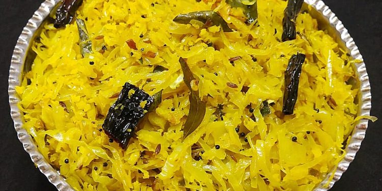 The tasty Kerala Style Cabbage Thoran is ready. Transfer to a serving bowl.