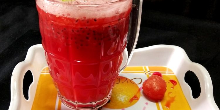 Pour the blended juice in a shaker or a bottle which can be closed with a lid. Add Rose Syrup. ½ green Chilli, Lemon Juice, Water Melon Chunks and Basil Seeds. If required, add Ice Cubes also.