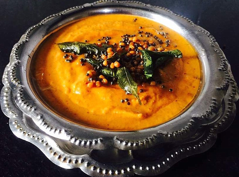 Heat 1 tsp of oil in the pan. Add Mustard and allow it to crackle. Add Curry leaves and allow it to fry.